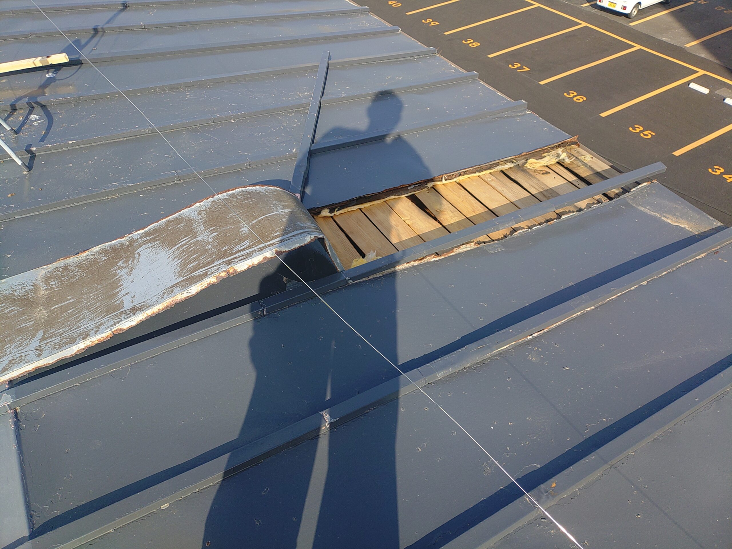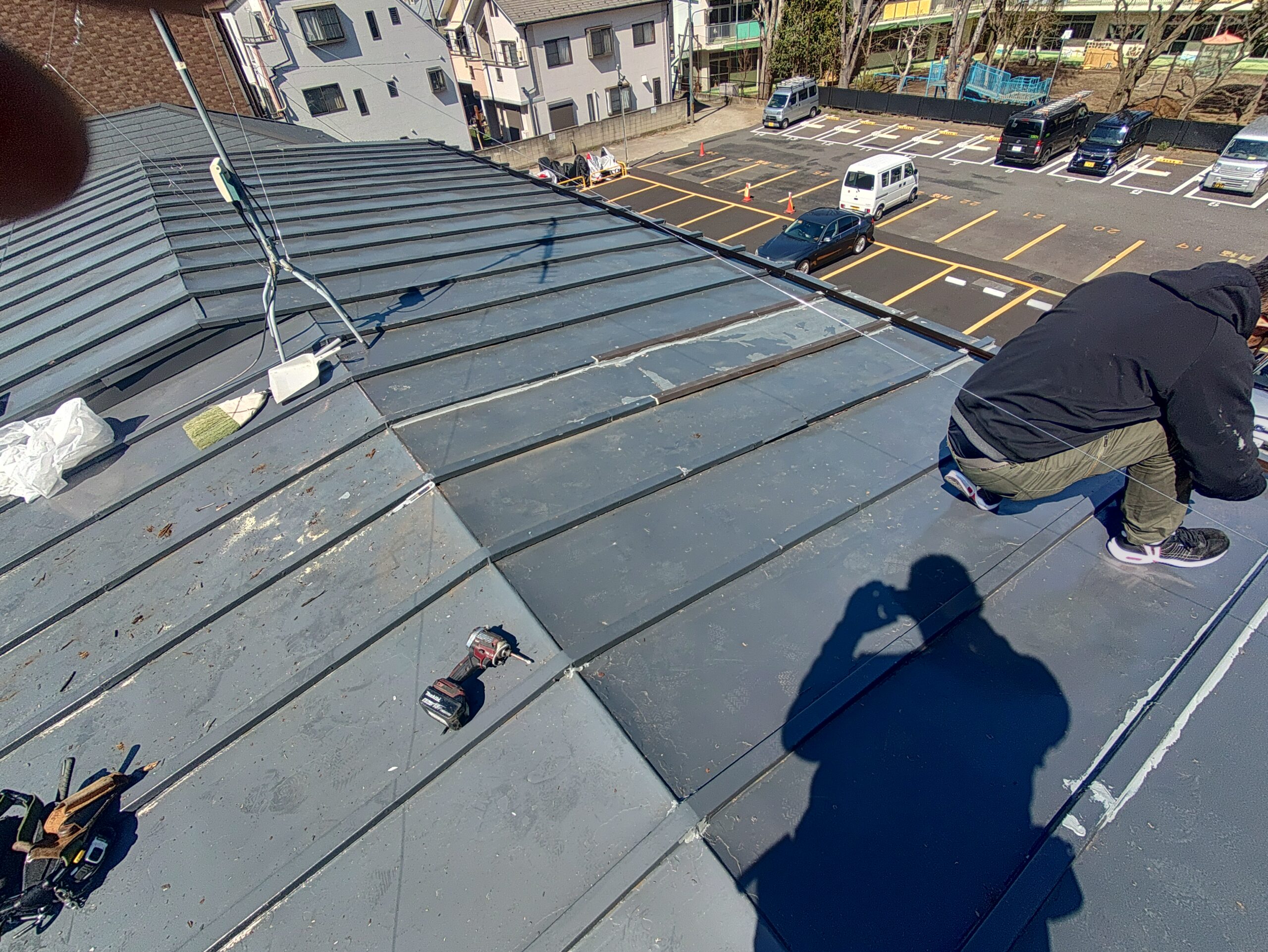 埼玉県和光市で、強風で剥がれた屋根の修理中です。